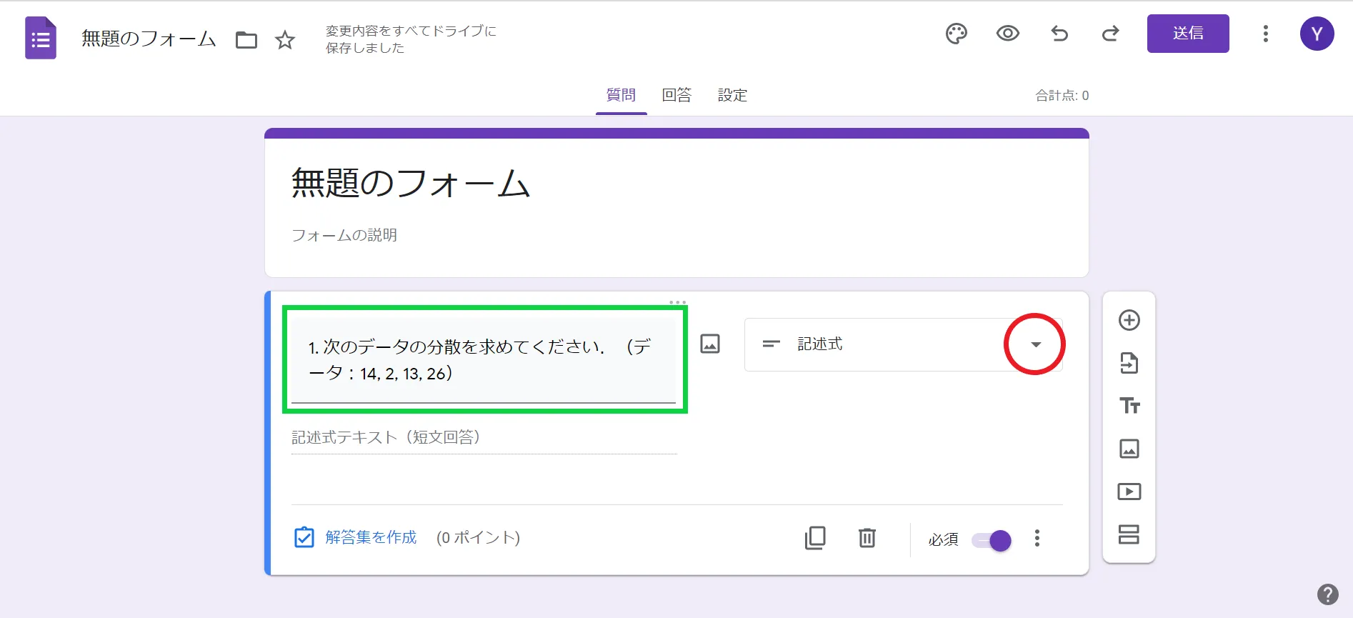 右側の下⽮印のアイコン(下図⾚丸)から「記述式」を選択します.