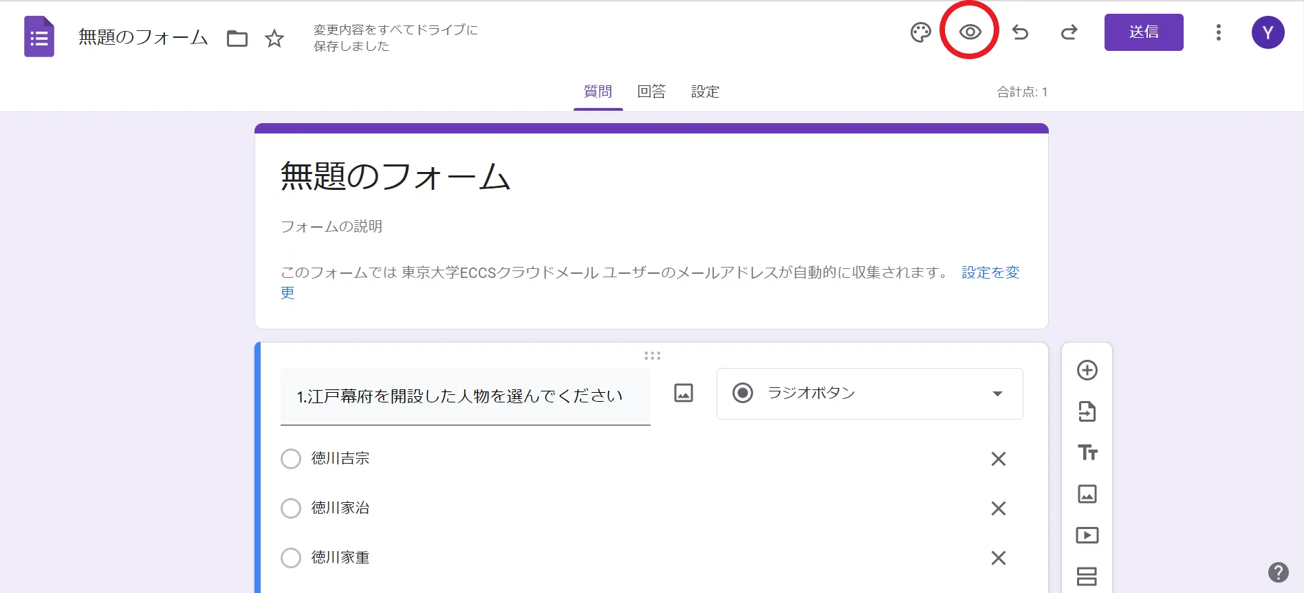 - 「東京大学ECCSクラウドメールと信頼できる組織のユーザーに限定する」がオンになっていることを確認します.なお「メールアドレスを収集する」を選択しておくと,回答者のECCSメールアドレスが自動的に記録されます.