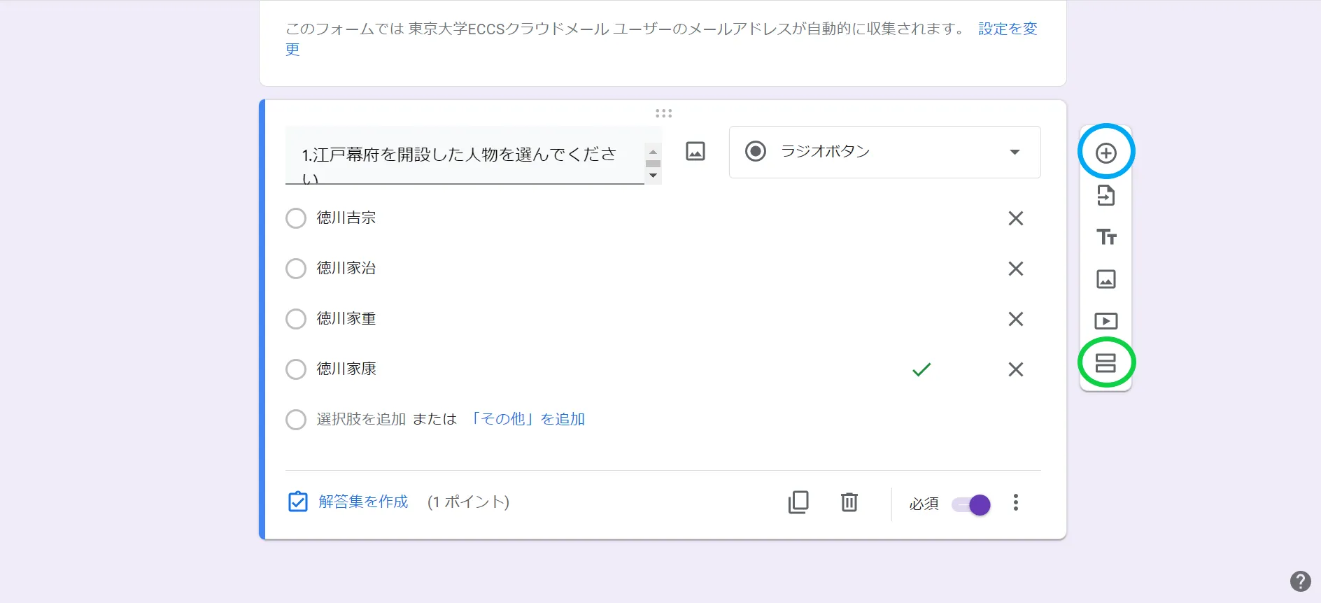 設問を増やしたい時は,右の丸十字ボタンのアイコン(下図水色の丸)をクリックすると,新たに質問項目が増やせます.大問を増やしたい時は四角2つのアイコン(下図緑の丸)のボタンをクリックすると,新たにセクション追加できます.