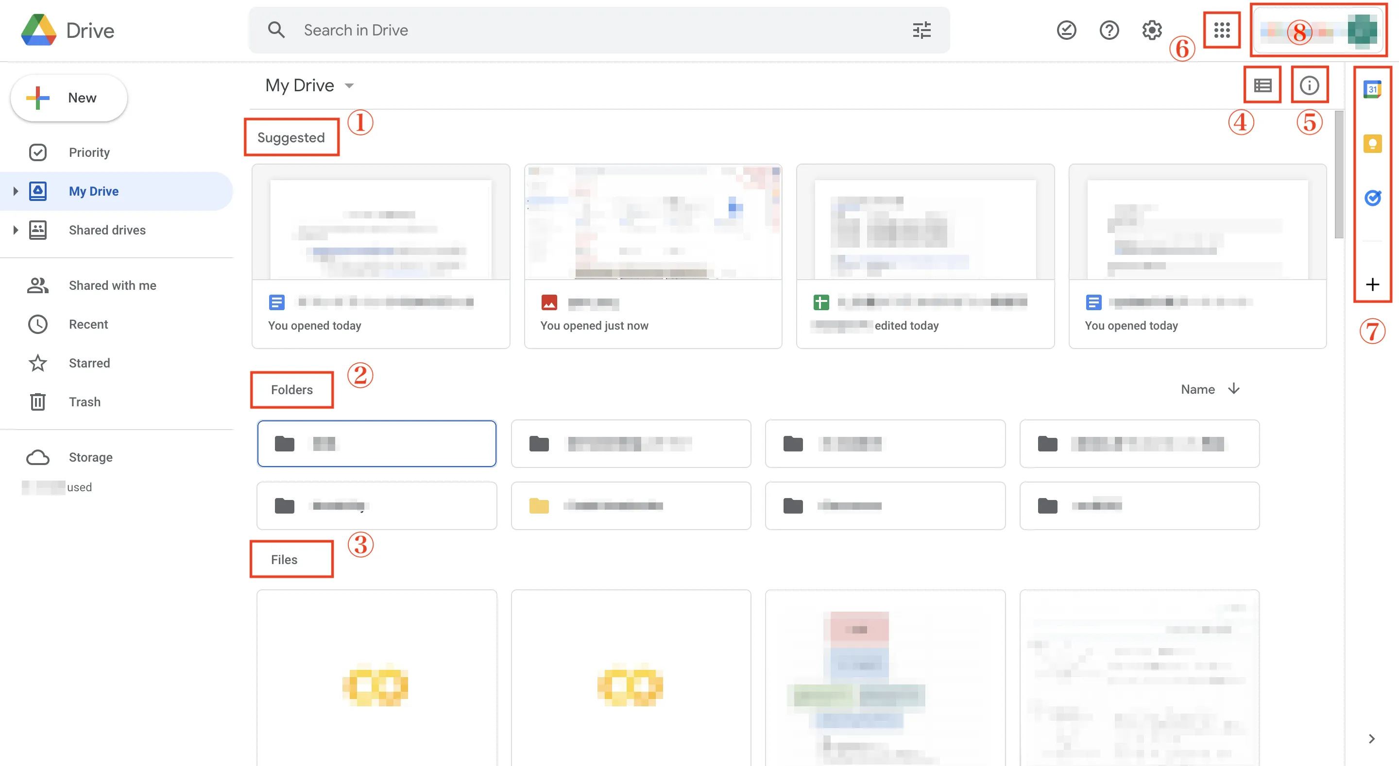• (2) Folders: A list of folders that you have created will be displayed here. However, even if you are not the creator, files uploaded through other Google applications (e.g. Google Classroom) may be automatically grouped into folders.