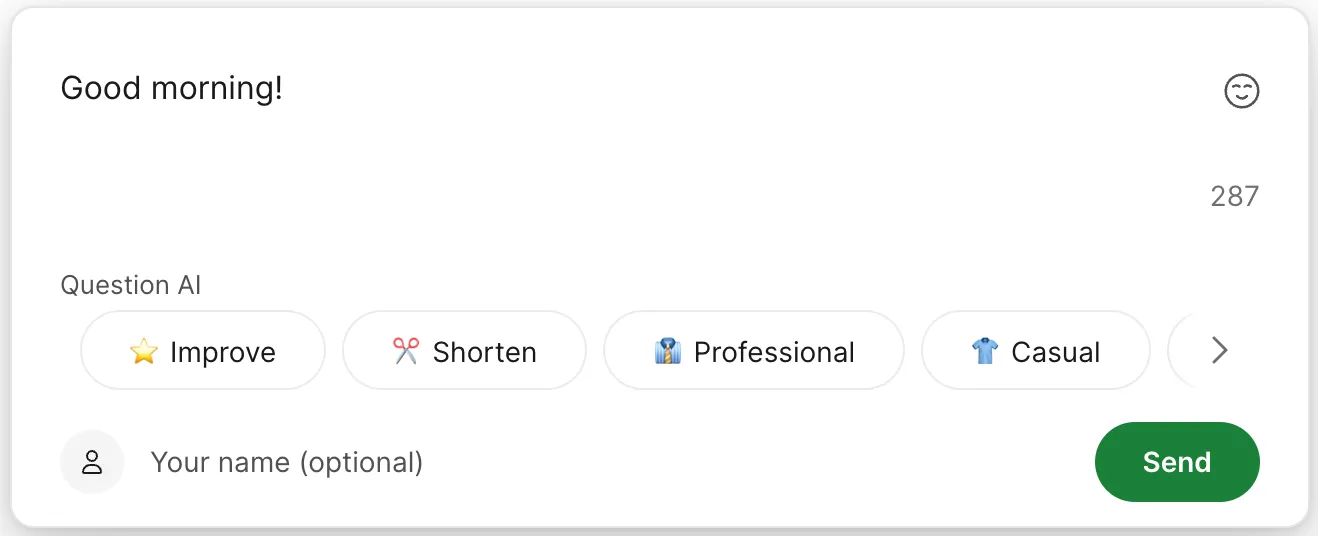 When you select an option in the “Question AI” section, the text you entered will be rewritten by the AI as follows: