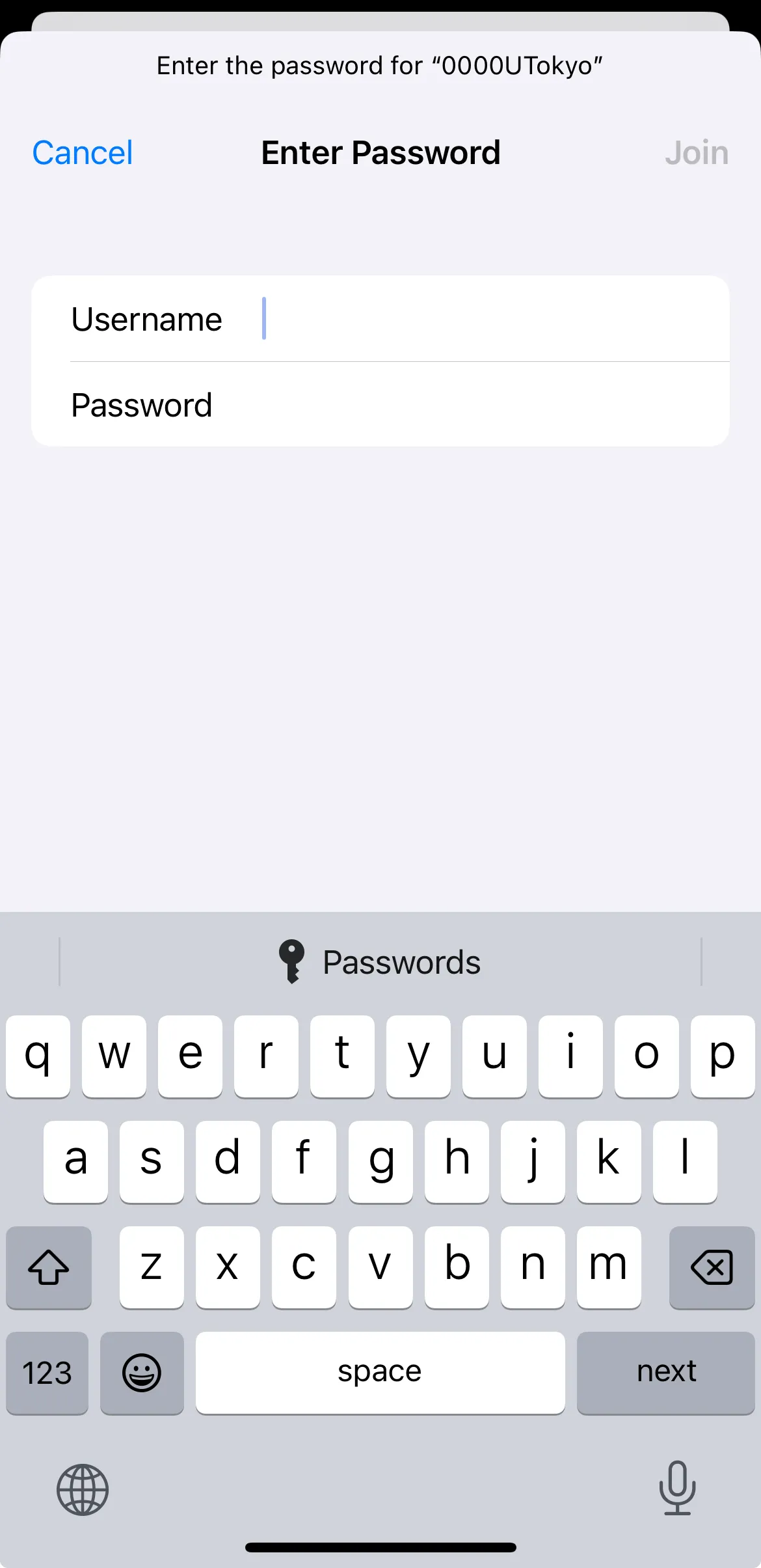 • Enter the user ID for the UTokyo Wi-Fi without skipping the u at the beginning and @wifi.u-tokyo.ac.jp at the end.
