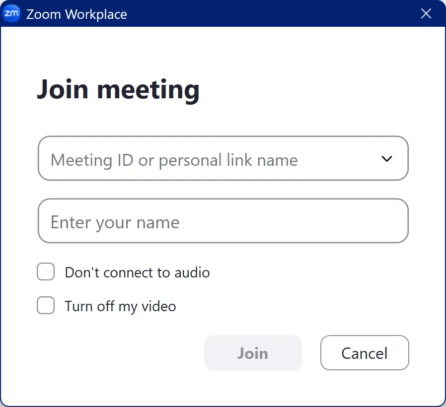 - A “Join Meeting” screen will appear. Enter the meeting ID in the “Meeting ID or personal link name” field. If you are not signed in, enter the name that you want displayed to participants in the meeting. When finished, click “Join”.