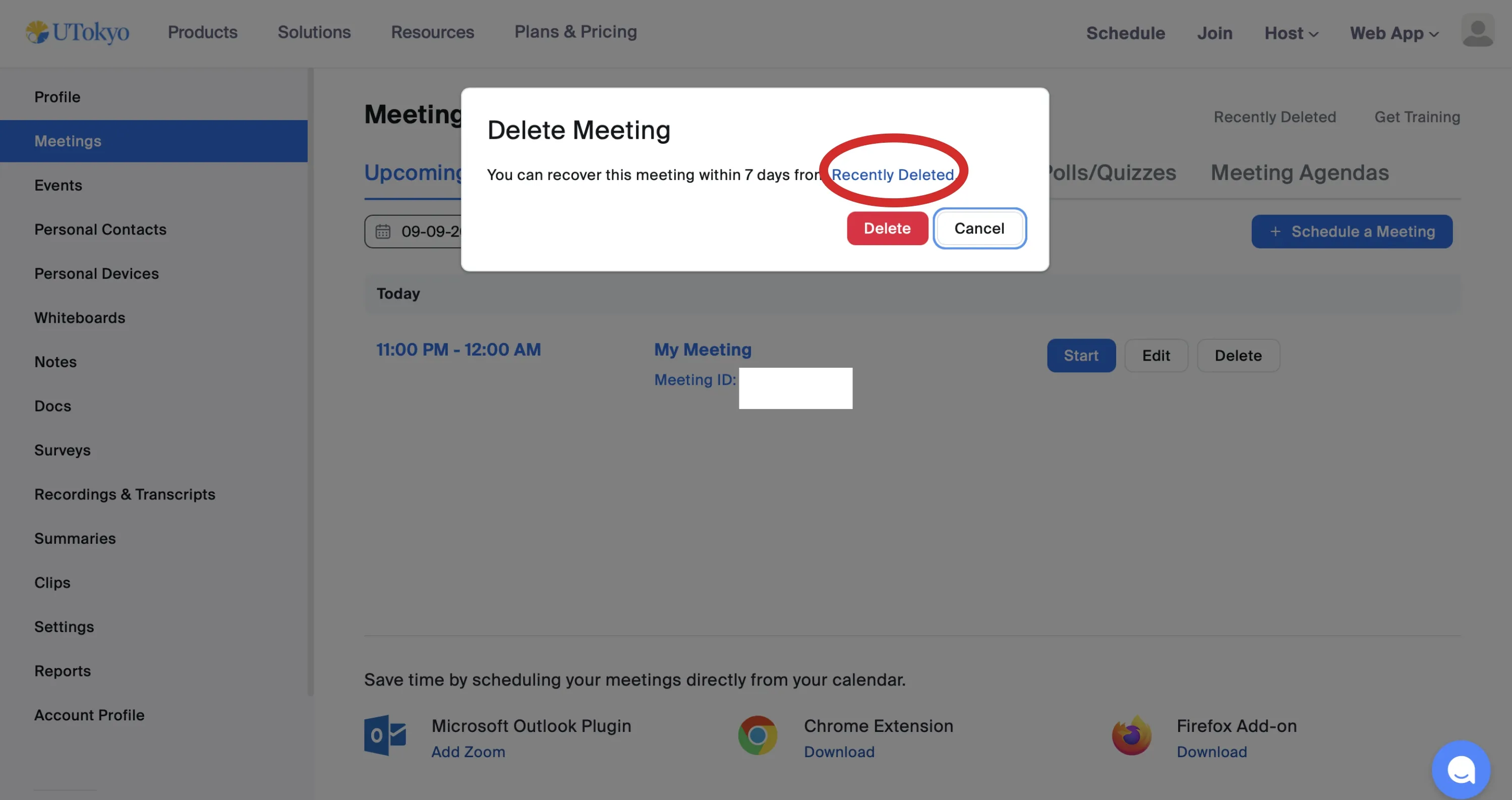 - Click Delete next to the meeting name to permanently delete the meeting without waiting for the 7-day retention period.