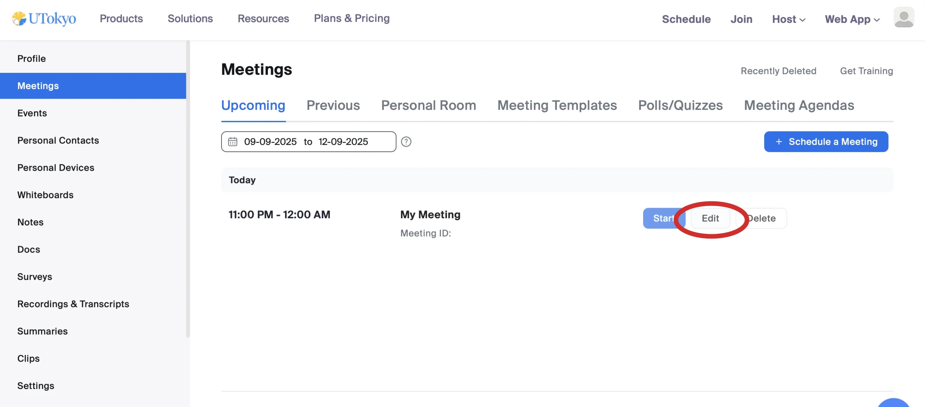 - Hover over the meeting you want to operate on, and click the Edit button that appears. This opens the Edit “My Meeting(This is where the name of the meeting you scheduled will be inserted)” screen.
