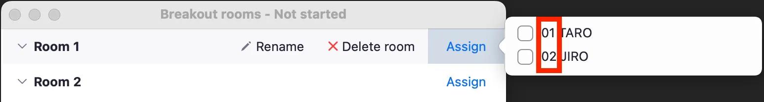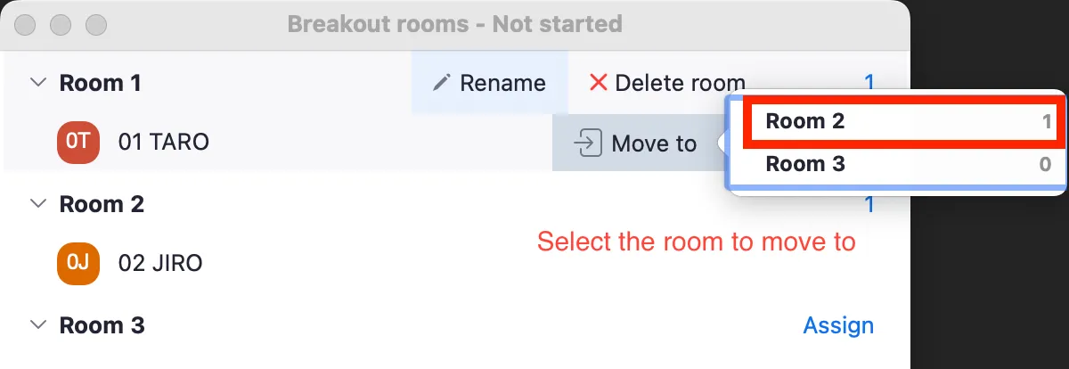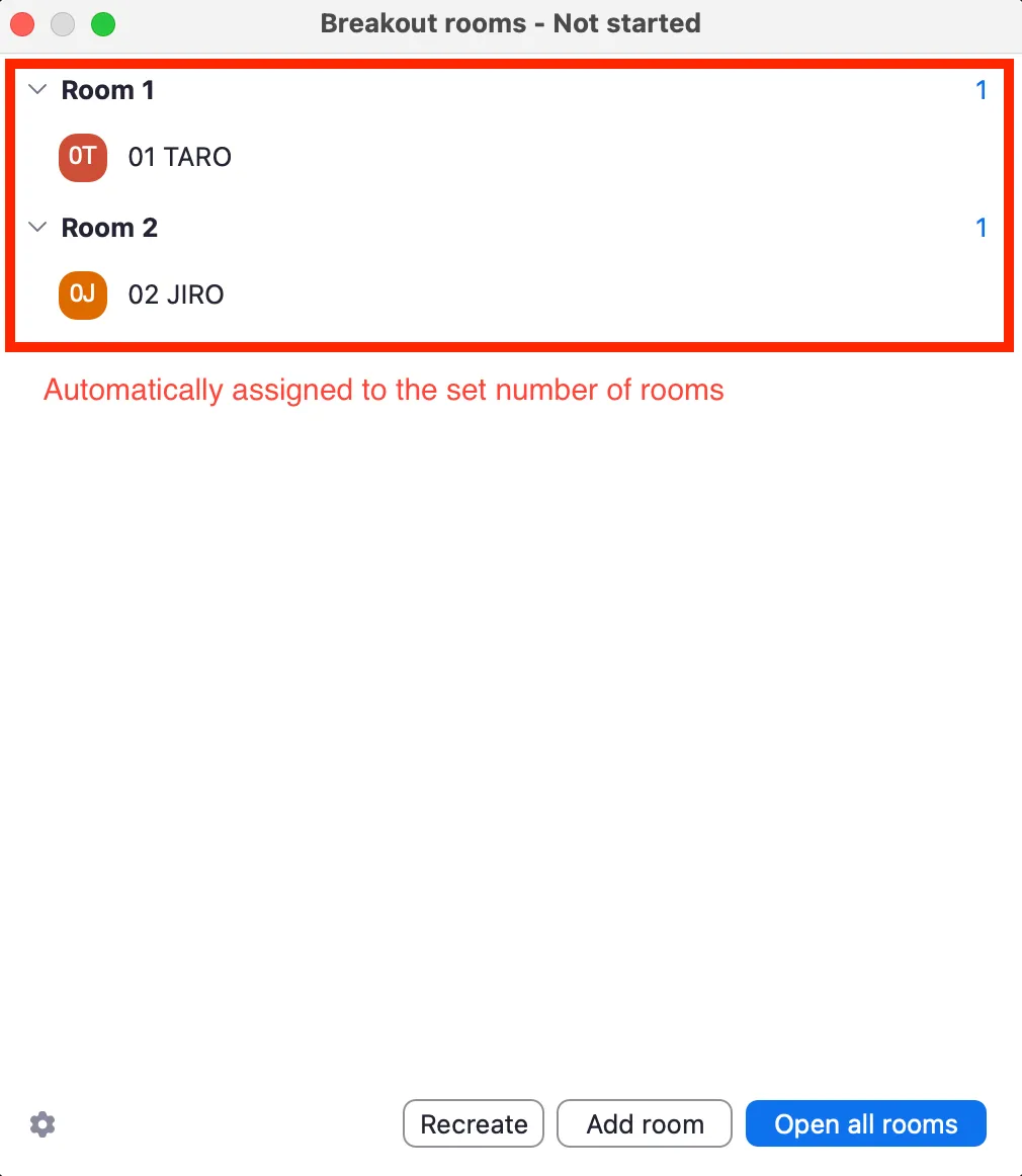 If you create the exact number of rooms needed, you have to sum up the participant count next to each room to check if everyone has been assigned. By creating one extra room, you can more easily prevent omissions. After completing the assignments, if you try to assign someone to the extra room, a message will appear stating, “All participants have been assigned to breakout rooms.”, making confirmation easy.