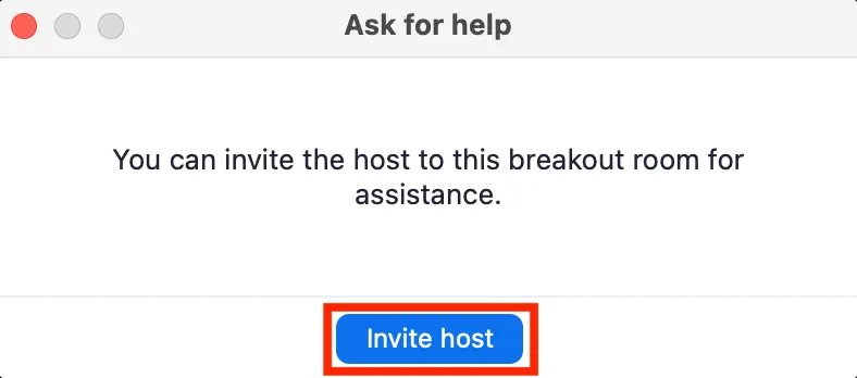 2. A window like the one below will appear. Click “Invite host”. A notification will then be sent to the host to join the breakout room from which the request was sent.