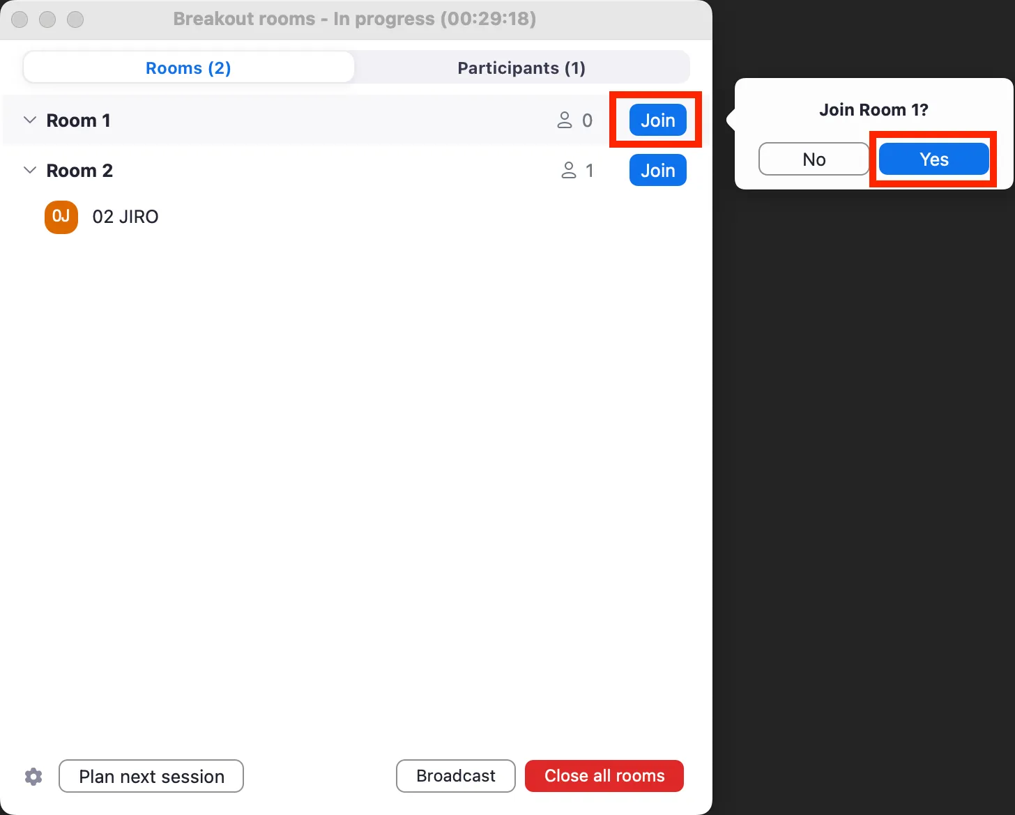 2. A list of currently open breakout rooms will be displayed. Select “Join” next to the room you want to join, and then click “Yes”.