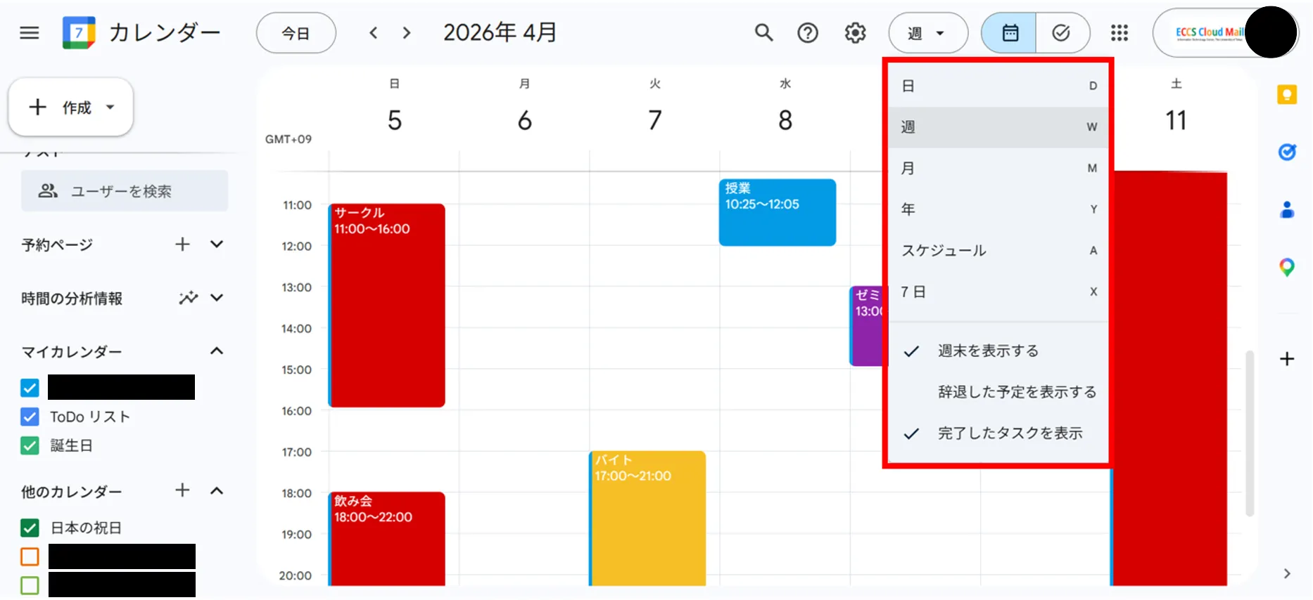 やるべきこと(タスク)をGoogleカレンダーに登録することができます.タスクを登録することで,タスクを実施する時間と他の予定との調整をしやすくしたり,リマインダーとして利用したりできます.なお,タスクの作成は画面右上にあるチェックマーク([ToDoリスト]に切り替える)からも行うことができます.カレンダーにおいて,タスクは下の画像の赤枠のように表示されます.