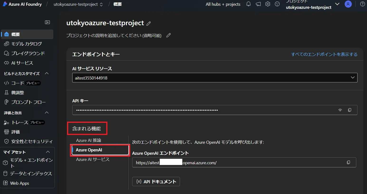 - Azure OpenAI Studio または Azure AI Foundry の概要に API キー及びエンドポイントの表示があります.これらをコピーしてください.