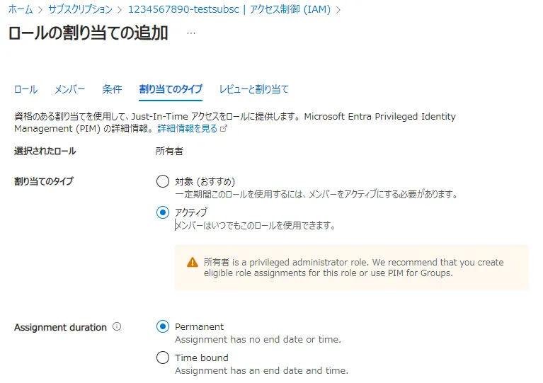 アクティブを選択してください.※ライセンスの都合上対象は現時点では選択しないようお願いします. - Assignment Duration: