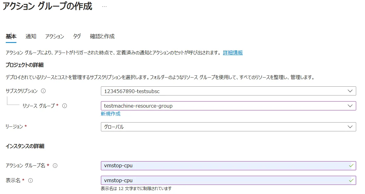 - アクショングループ名,表示名:自由に設定ください.ここでは両方とも