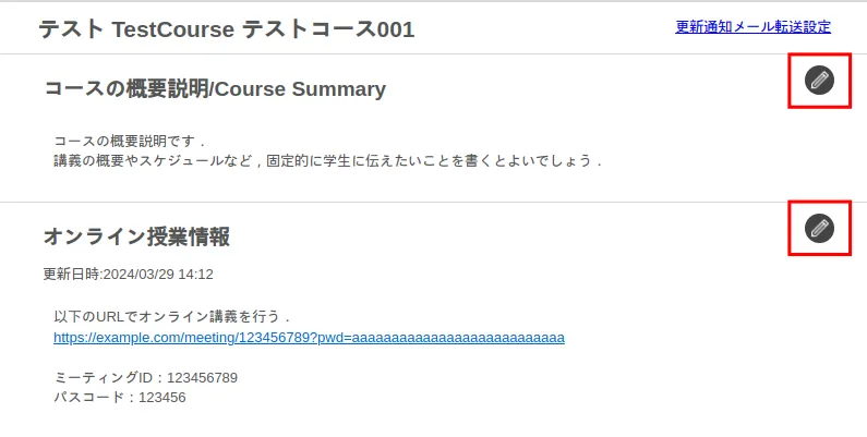 これらは,コーストップの右端にある(鉛筆のマーク)を押すと編集できます.なお,「コースの概要説明」は,「コース設定→コースの概要説明」1からも編集画面を開くことができます.