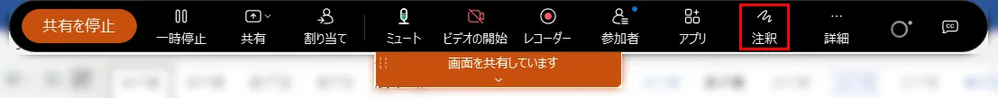 ホワイトボードの共有を開始すると,最初から注釈オン・参加者の注釈オンの状態になります.(必要に応じてオフにすることもできます.)